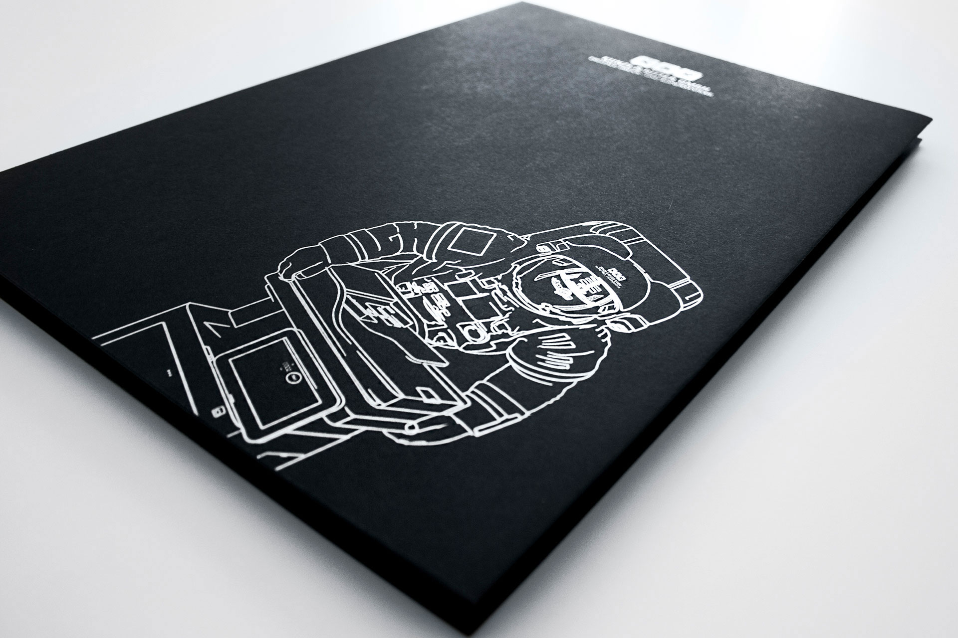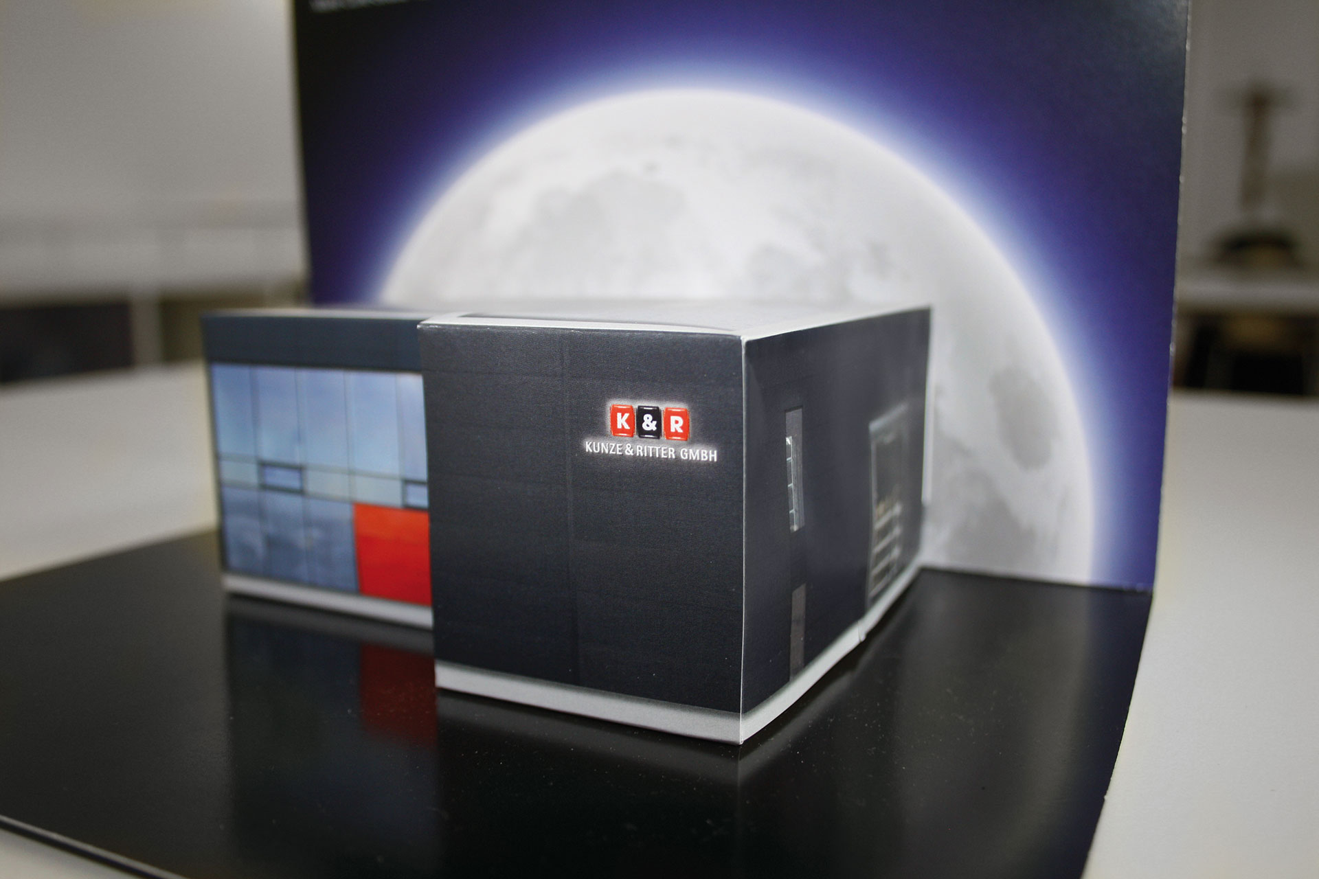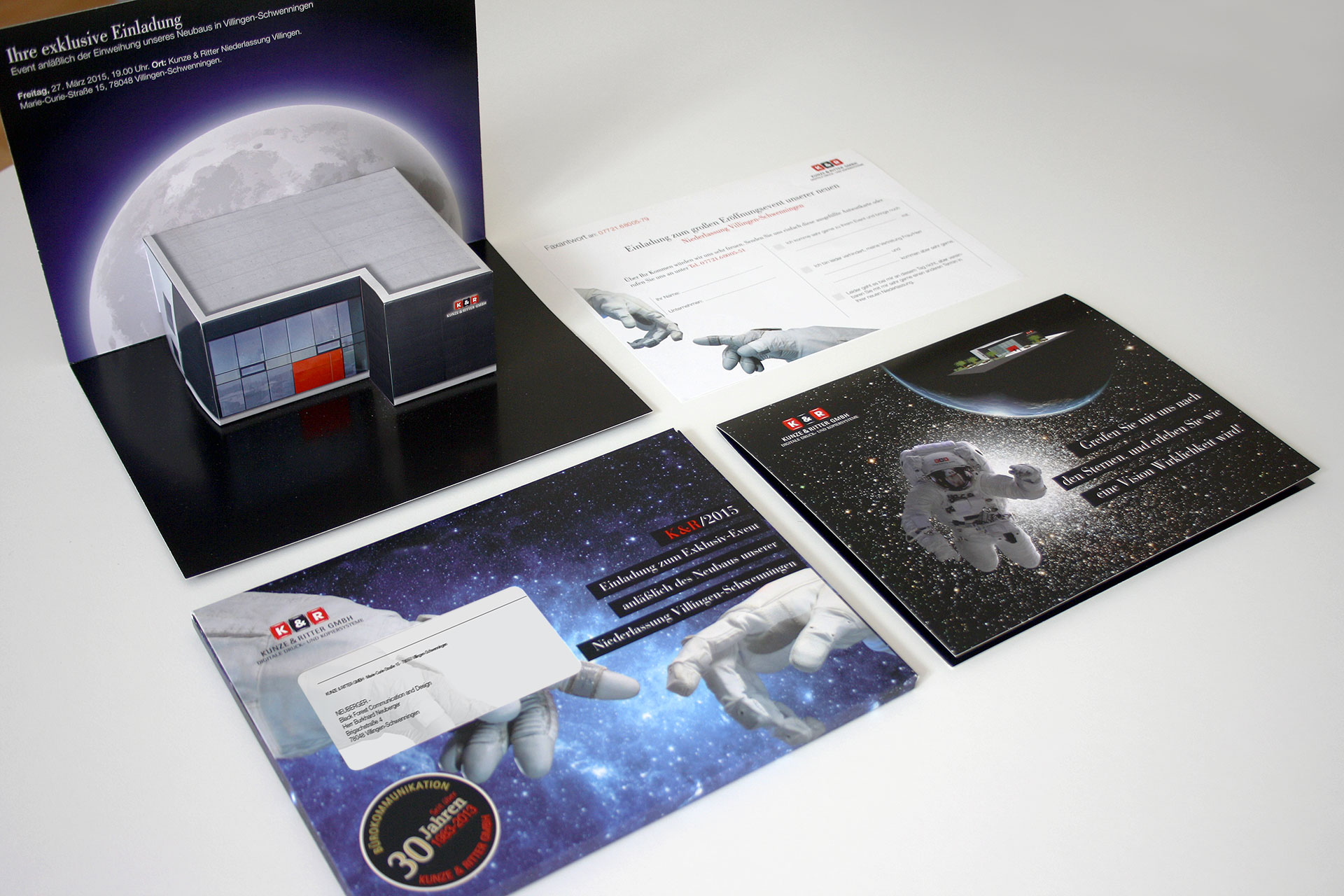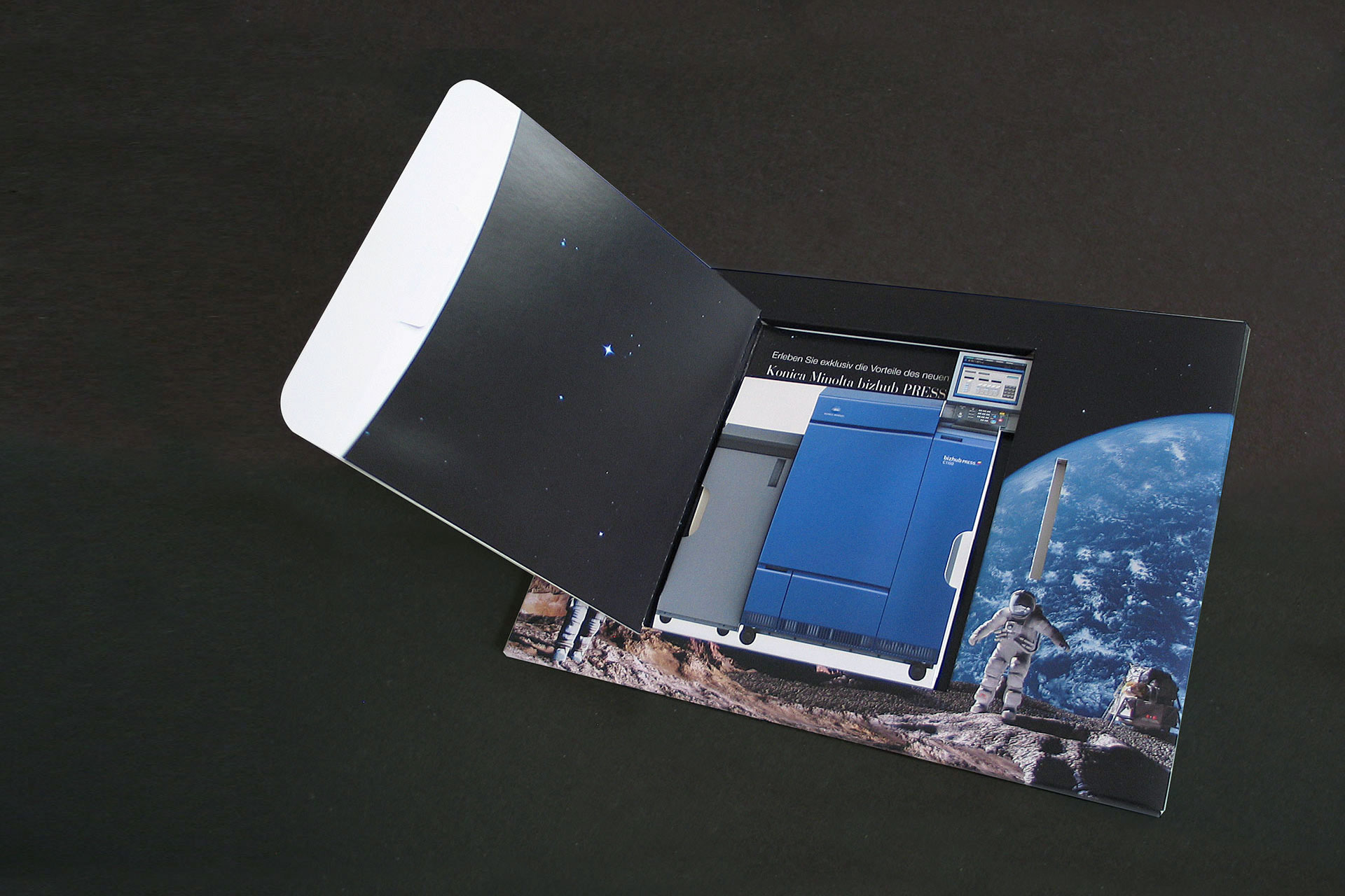 Unser langjähriger Kunde K&R verspricht seinen Kunden: „Wir kommen auch zu Ihnen“. Unter diesem Motto wurde in der Einladung als Bildsprache für die Präsentation eines neuen Drucksystems von Konica Minolta das Thema Weltraum gewählt. Umschlag in Sondergröße, digital bedruckt und das „ausziehbare Drucksystem“, das sich im Inhalt der Schiebers wiederfindet, erregte beim Hersteller und Kunden großes Aufsehen. Noch heute sieht man die Kartondrucksysteme auf den Schreibtischen der Kunden stehen.