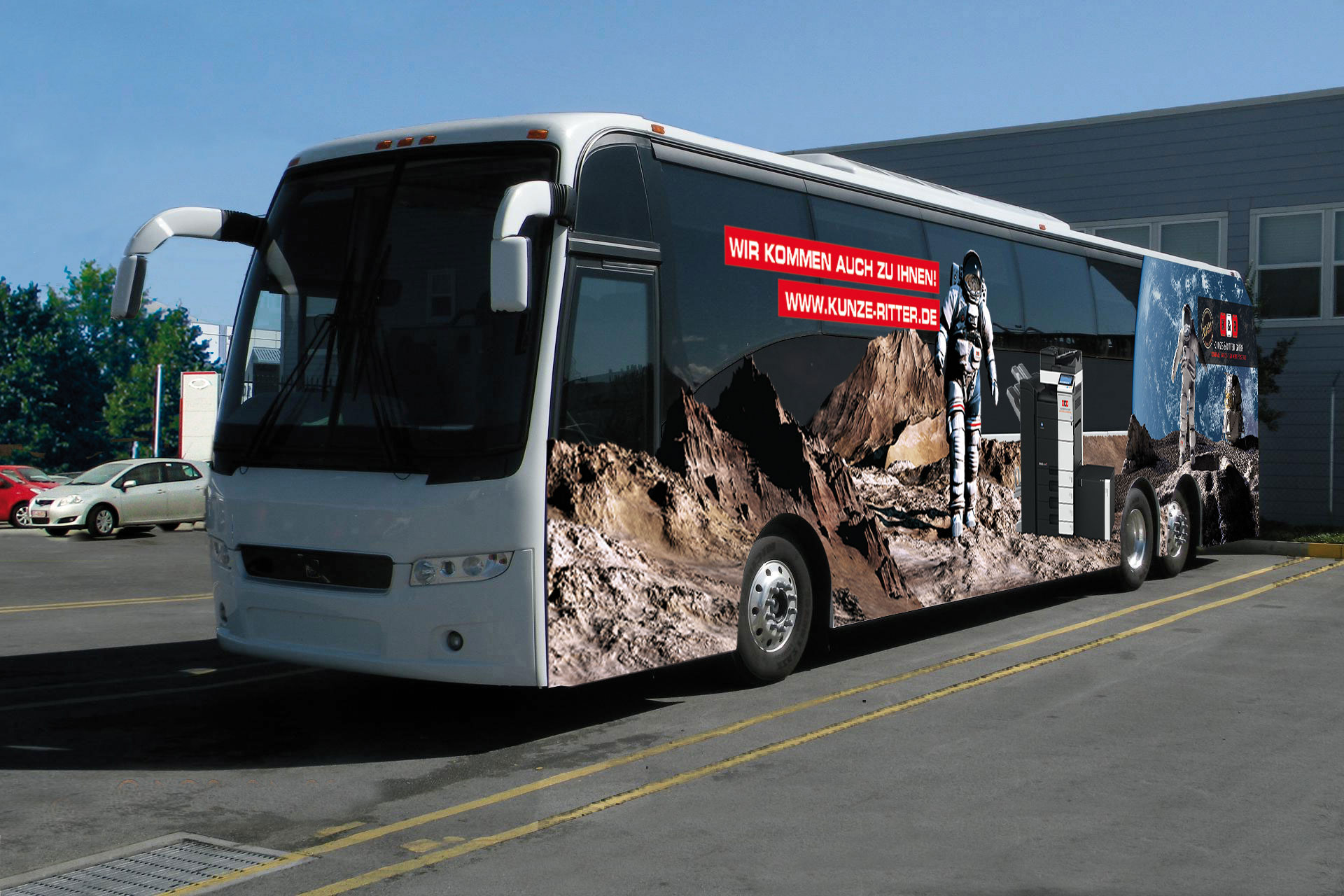 Ein unscheinbarer weißer Reisebus wird zum auffallenden Eyecatcher auf der Straße. Für unseren Kunden Kunze & Ritter wurde dieser Bus vollflächig mit über 55 Quadratmetern Digitaldruck beklebt.