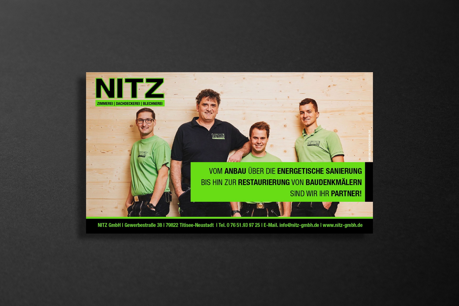 Die Nitz GmbH in Titisee-Neustadt ist seit 1992 der kompetente Ansprechpartner für Zimmereiarbeiten, Sanierungen, Dachdeckerarbeiten und Blechnereileistungen. Die Nitz GmbH ist neben Titisee–Neustadt, Hinterzarten und Freiburg auch im ganzen Hochschwarzwald, sowie in der Rheinebene tätig. Von der Logogestaltung (Nitz Denkmal), Geschäftsausstattung, Briefbogen, Visitenkarten, Homepage, Messe, Film, Fotografie, Imagebroschüre, Fahrzeugbeschriftungen, Anschreiben, etc. bis zum Anzeigenkonzept in Tageszeitungen dürfen wir mit Nitz seit nunmehr 4 Jahren einen gemeinsamen Weg gehen.