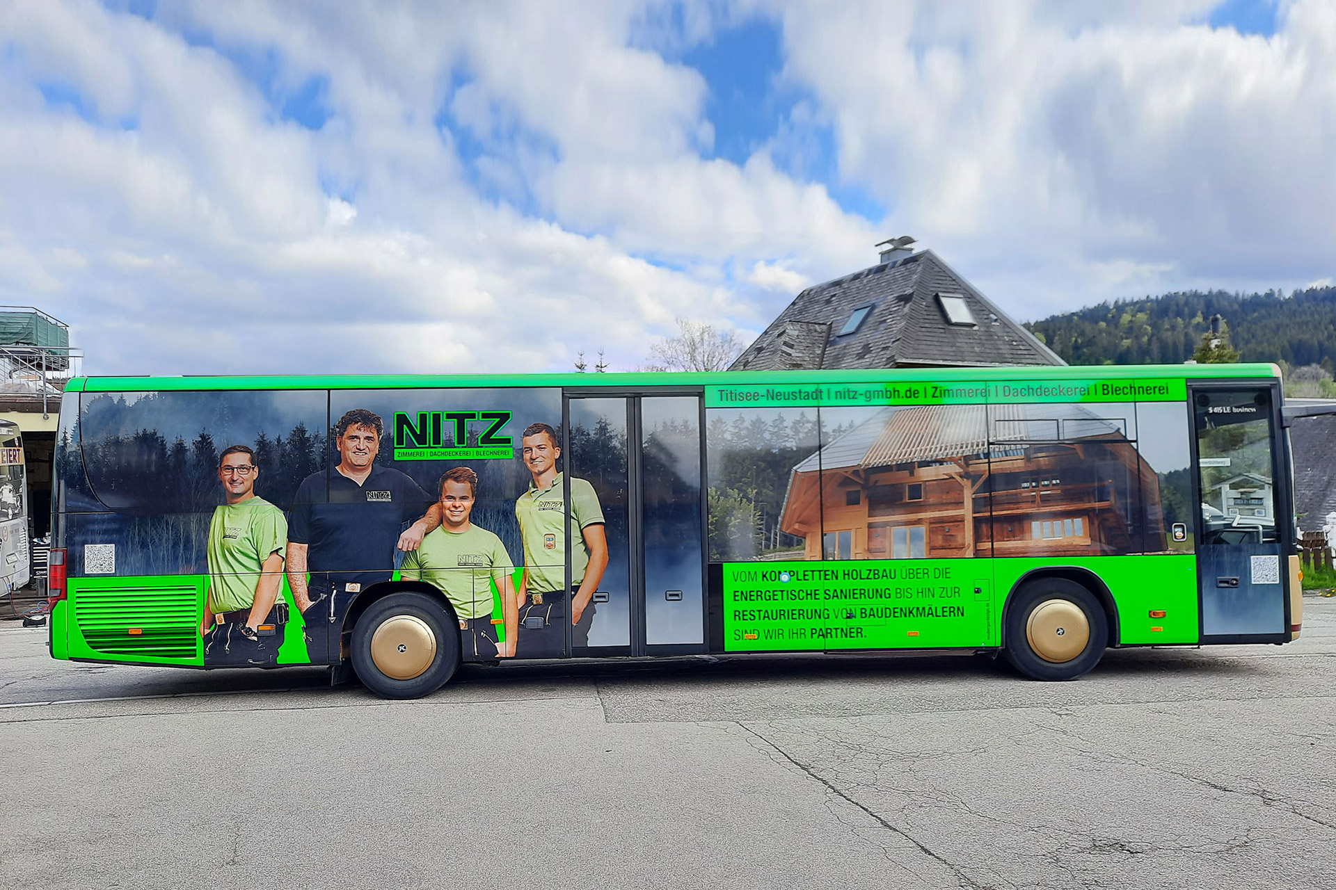 Und er passt hervorragend zu den sonstigen, vollflächig beklebten Firmenfahrzeugen der Firma Nitz. Vielen Dank für den Auftrag an Mischa Schwörer und Ralf Faller.