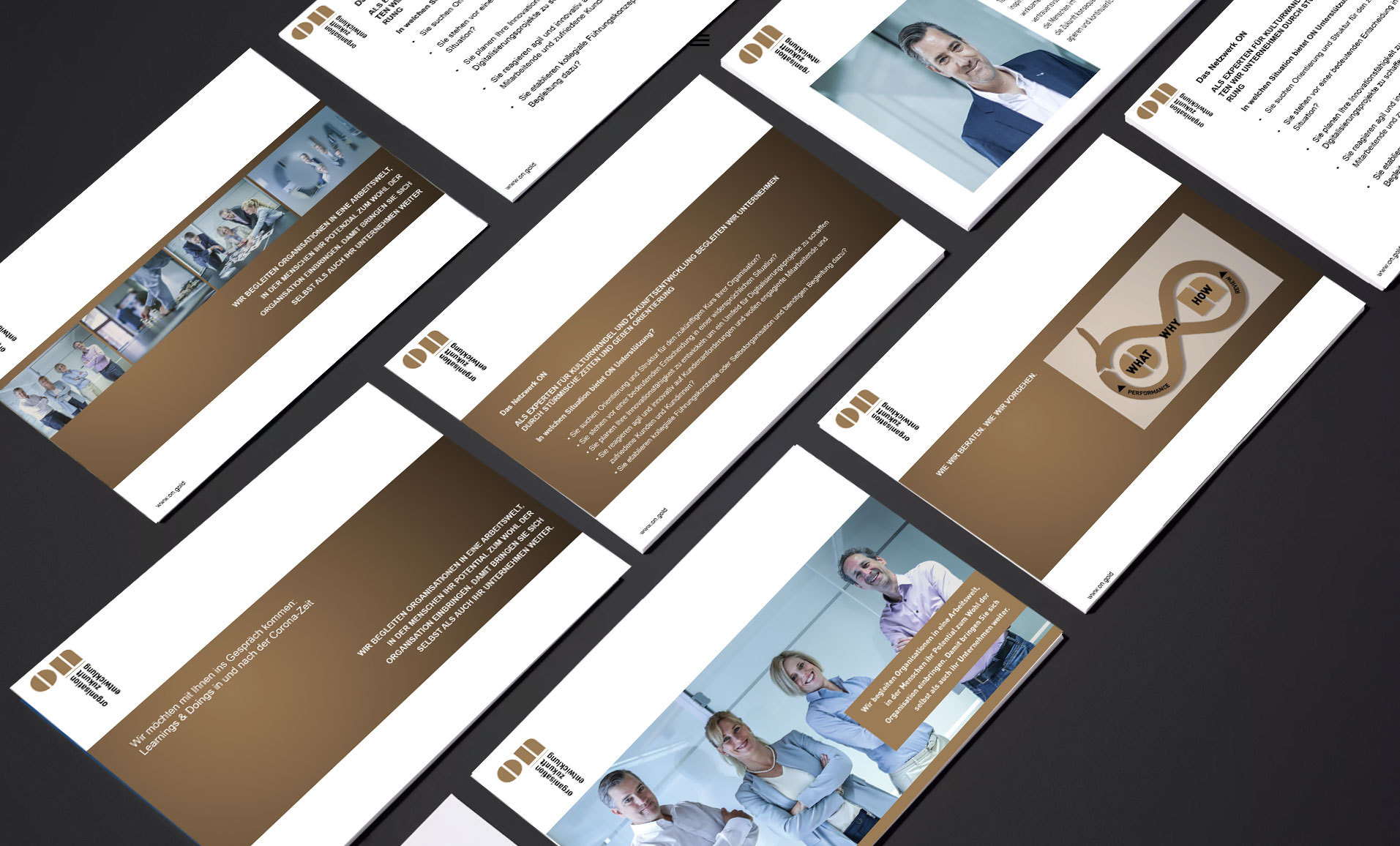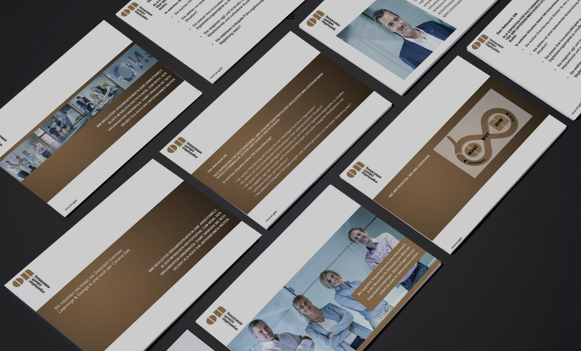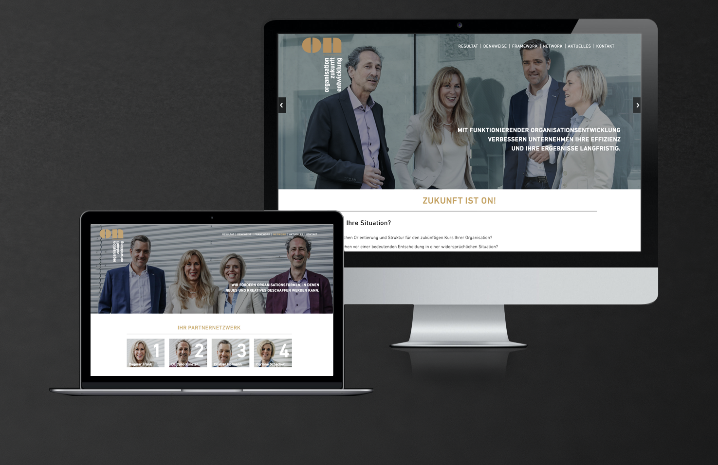 Für unseren Kunde ON. ORGANISATION. ZUKUNFT. ENTWICKLUNG. haben wir das komplette Corporate Design entwickelt. Neben der Entwicklung von Logo, Claim und Colouring wurde eine responsive Website und Power-Point-Präsentation erstellt.